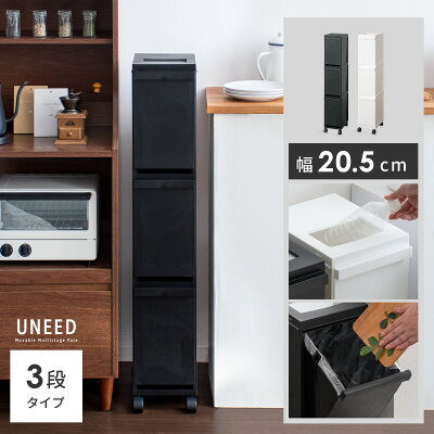 限られたスペースにすっきり収まる多段式ペール”UNEED(ユニード)”わずか約幅20.5cmのスペースで、キッチン周りのゴミを複数のゴミ箱で分別しながらひとまとめに捨てていただけます。