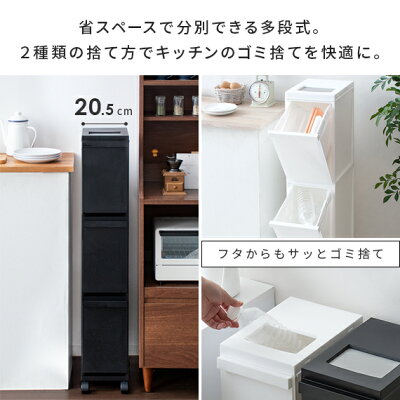 【3段タイプ】 サイズ:約幅20.5×奥行き29.5×高さ105.5cm プッシュフタ内寸:約幅14×奥行き8.5cm 引き出し開口部内寸:約幅16×奥行き19×高さ28.5cm 内容量:約10リットル(1段あたり)×3 対応ポリ袋:口幅45×高さ56cm以上 製品重量:約3.5kg 耐荷重量:約1.5kg(1段あたり) 材質:本体・プッシュフタ/ポリプロピレン キャスター/ポリプロピレン、ポリカーボネート、スチール バネ/ステンレス 備考:組立式(組立て時間約5分)、キャスター付き(4個) カテゴリー:ゴミ箱/スリム/キッチン/分別/ふた付き/角型/ダストボックス/シンプル/リビング/モノトーン/キャスター付き/多段式ペール UNEED(ユニード)3段タイプ/ホワイト/ブラック/C-SLINK406S【3段タイプ】 サイズ: 約幅20.5×奥行き29.5×高さ105.5cm プッシュフタ内寸: 約幅14×奥行き8.5cm 引き出し開口部内寸: 約幅16×奥行き19×高さ28.5cm 内容量: 約10リットル(1段あたり)×3 対応ポリ袋: 口幅45×高さ56cm以上 製品重量: 約3.5kg 耐荷重量: 約1.5kg(1段あたり) 材質: 本体・プッシュフタ/ポリプロピレン キャスター/ポリプロピレン、ポリカーボネート、スチール バネ/ステンレス 備考: 組立式(組立て時間約5分)、キャスター付き(4個)